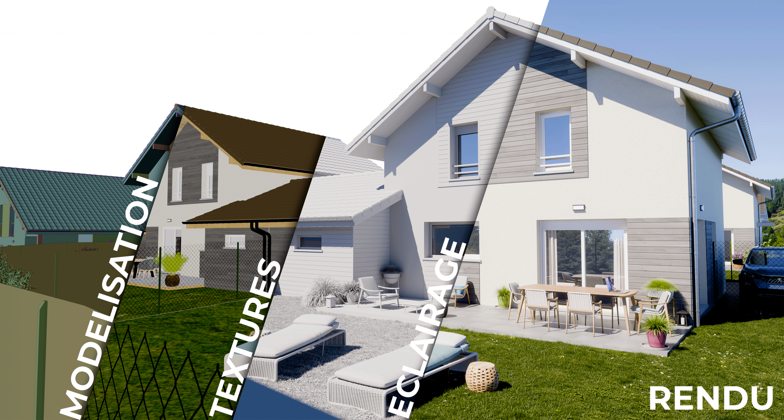 À partir de vos fichiers (idéalement DWG pour plans, façades, coupes ou plan de masse, accompagnés du permis de construire), je réalise une modélisation 3D précise. Selon votre cahier des charges, j’applique des textures et matériaux réalistes. Pour donner vie au projet, j’utilise le ray tracing pour créer un éclairage naturel ou artificiel qui met en valeur votre projet. Un premier rendu vous est présenté pour vérifier qu’il correspond à vos attentes, avec la possibilité d’apporter quelques ajustements si nécessaire.